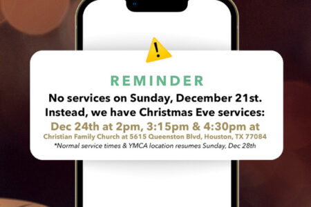 There will be no Sunday, December 21st services but we will have 3 identical services on Christmas Eve at 2PM, 3:15PM & 4:30PM. Details are below! Christ Covenant Christmas Eve Services Wednesday, December 24th at 2PM, 3:15PM & 4:30PM Join Christ Covenant for Christmas Eve services located at Christian Family Church on 5615 Queenston Blvd, Houston, TX 77084. Experience a special one-hour candlelight service featuring powerful worship, an inspiring Christmas message, and the beauty of celebrating Jesus’ birth together. And don’t forget to hop…